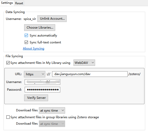 打开Zotero, 选择’Edit/Preferences/Sync/settings’, 如图配置WebDAV。同时也可以看到,对于Zotero,文献库结构和附件确实是分开同步的。但是需要注意,用坚果云同步Zotero/zotero.sqlite*并不明智,因为软件一打开该文件就在占用状态。坚果云解除文件的占用并不及时,若一台设备在退出软件后就断网或关闭,文件将一直处在占用状态,导致其他设备上的Zotero无法正常使用。