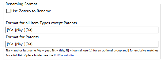 可以利用元数据和正则表达式对PDF文件进行重命名。选择’Tools/ZotFile Preferences/Renaming Rules’。下图所示的命名规则即“作者_年份_标题”。